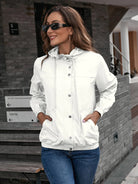 This women's hooded raincoat combines comfort and style, protecting you from the elements while remaining fashionable. Its waterproof and windproof design, combined with a hood for extra protection, makes it an ideal choice for rainy days. The button closure and drawstrings add functionality while maintaining a sleek silhouette.