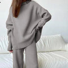 This two-piece set is the perfect combination of softness and style for your relaxing moments. Featuring a loose-fitting, long-sleeved top and straight-legged pants, it offers a comfortable, flowing fit. Its soft ribbed fabric lightly envelops your figure, ideal for a cozy and refined look at home.